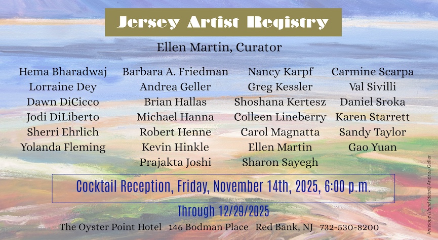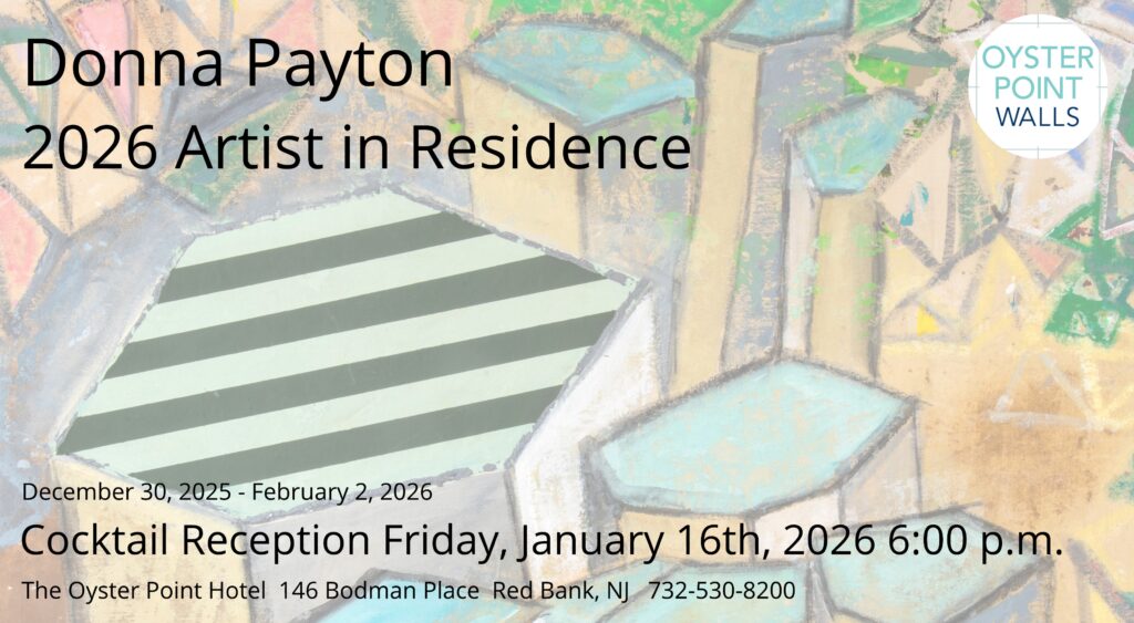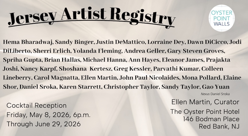 This exhibit is free and open to the public. It will open on Friday, July 16th, 2021, with a cocktail reception from 6 – 8 p.m. and run through September 6th. The Oyster Point Gallery is located at 146 Bodman Place, Red Bank, NJ, USA. There is free parking in our lot and valet service is available.